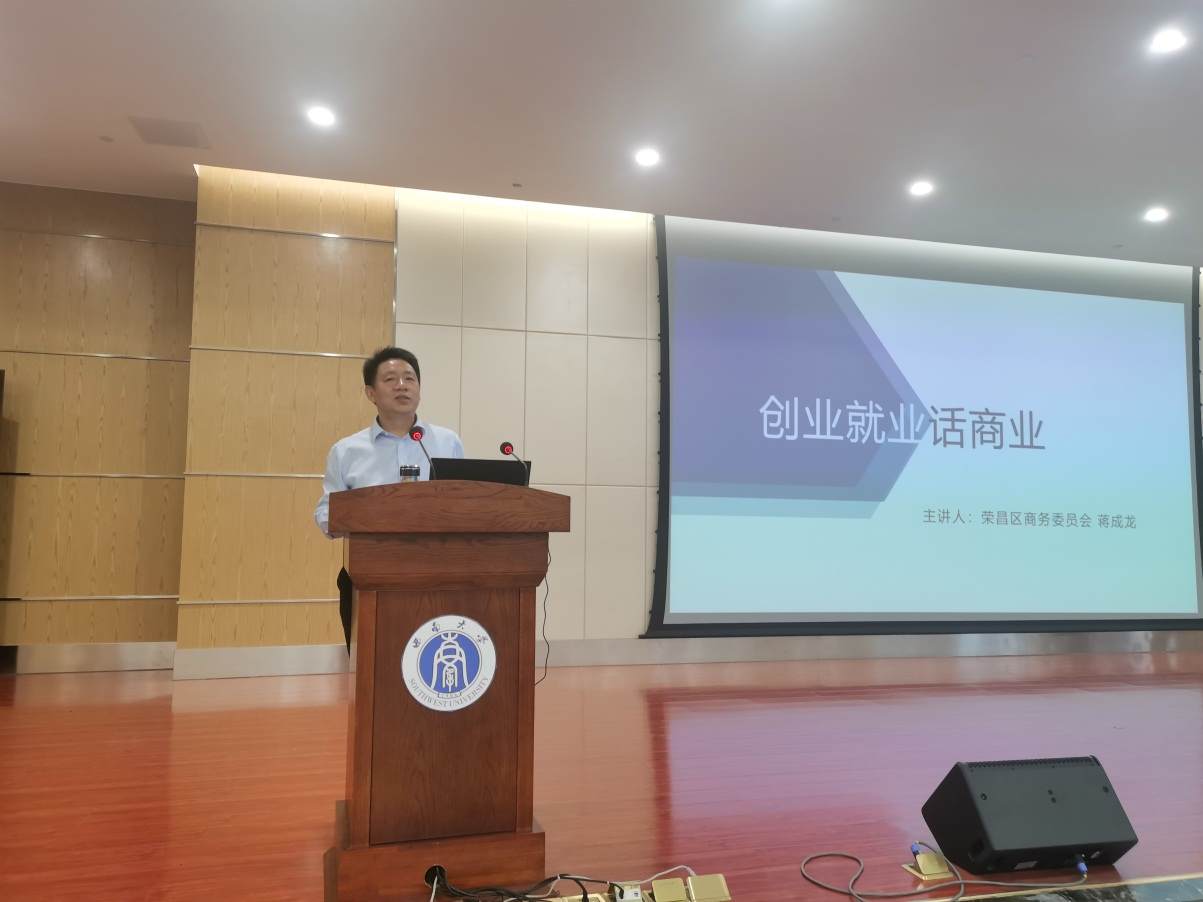 蒋成龙书记就荣昌区商业现状分析、荣昌区商业未来发展规划、老员工创业就业思路等内容展开,他指出,荣昌区当下按照“一区两圈、一圈多街、一圈一特色、一街一风格”工作思路,抢抓成渝地区双城经济圈建设重大战略机遇,有着前所未有的发展契机;并通过分享创业成功个人、先进企业等案例,鼓励当代老员工勇于创新、积极创业,希望bevitor伟德学子以发展眼光看荣昌区商业机遇,并欢迎学子们扎根荣昌,创业发展;最后,他讲到“创业即就业”,就业创业更是探索人生价值的重要方式,地方政府与高校之间应加强合作,共促发展,探索有效的人才激励机制,实现人才就业创业的多元化、本土化。
