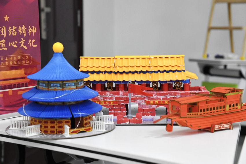 在“发挥团结精神,感悟匠心文化”环节,与会人员分成两个小组,以团队的形式协作完成作品搭建。同志们在通力合作、堆砌一砖一瓦的过程中感受到“干一行、爱一行、钻一行”的钻研精神与对极致的追求精神!看着搭建好的庄严肃穆的天安门城楼、宏伟精美的祈年殿以及承载千钧的南湖红船,大家不仅震惊于古典建筑的设计之精妙,更沉浸于其中蕴含的深厚历史印记。