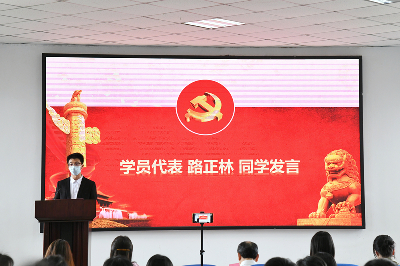 随后,学员代表路正林同学发言。他代表培训班学员郑重承诺:端正学习态度,加强理论学习;积极参加组织活动,提升综合素质。
