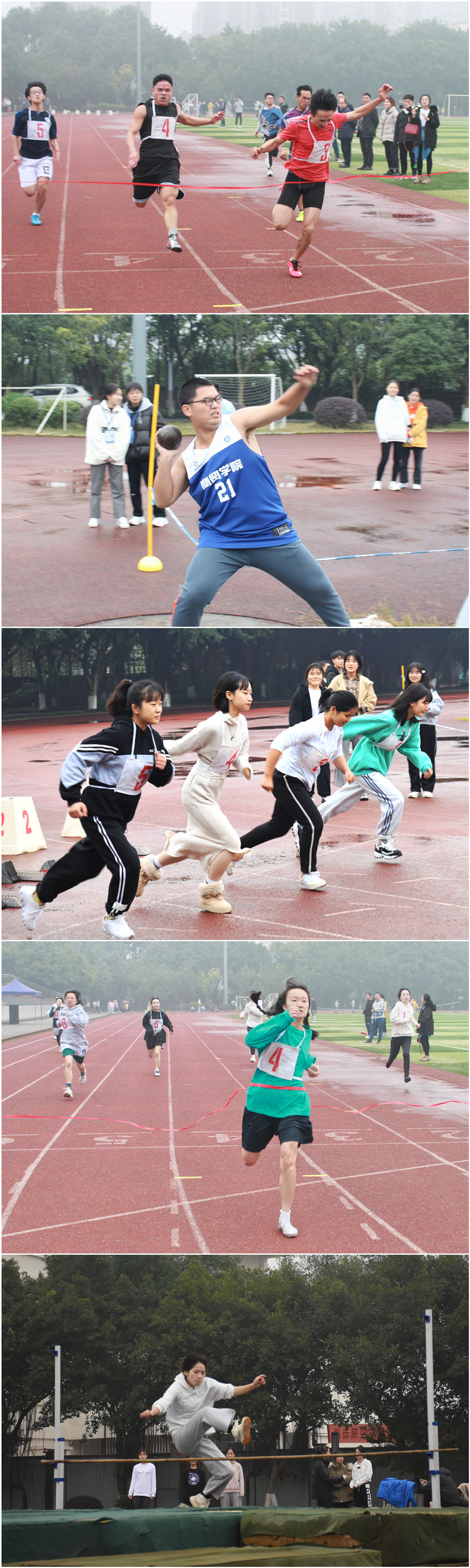 开幕式结束后,各项比赛也随之展开。商贸运动健儿们在运动场上尽展风采,将比赛场地围得水泄不通的同学们也鼓足了劲为选手们加油喝彩。从19市营6班取得集体项目跳长绳第一名再到19公管3班龙小凤取得女子三级跳远第一名,运动员们在无数的期待和加油中英姿飒爽,充满活力,取得骄人的成绩!最终取得团体总分前三名的分别是20信管2班、21市营9班、19市营2班。在比赛中,21市营2班蒋天翼、20国贸3班刘芳、20市营5班潘程辉更是挑战自我、勇攀高峰,分别打破了男子100米、女子400米、男子铅球记录。