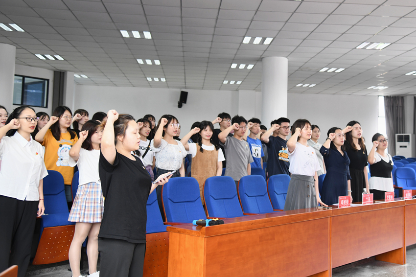 奏唱国歌以后,全体党员重温入党誓词,铿锵有力的宣誓声表达出了不忘初心、牢记使命的信念和决心,胸前的党徽与面前的党旗交相辉映、熠熠生辉。