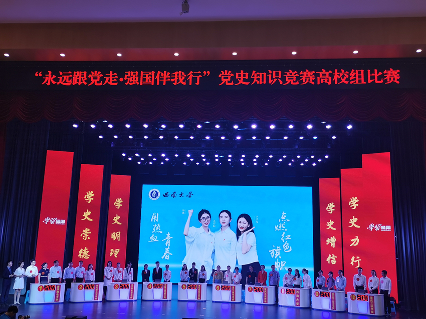 本次比赛由中共重庆市委教育工委、重庆市教育委员会主办,来自重庆市的五十六支高校代表队参赛。赛事设置理论测试、现场竞答两个阶段。现场竞答包含“星火挑战”“日新月异”“峥嵘岁月”“砥砺前行”4个环节,以习近平《论中国共产党历史》《毛泽东、邓小平、江泽民、胡锦涛关于中国共产党历史论述摘编》《习近平新时代中国特色社会主义思想学习问答》《中国共产党简史》等指定学习材料为主要内容,优选“学习强国”学习平台“我要答题”等作为竞赛内容。比赛中,公司参赛选手聚精会神、沉着应答,既展现出扎实的理论功底,又展示出昂扬向上的精神风貌。经过激烈角逐,公司代表队力克劲敌,脱颖而出,斩获佳绩。