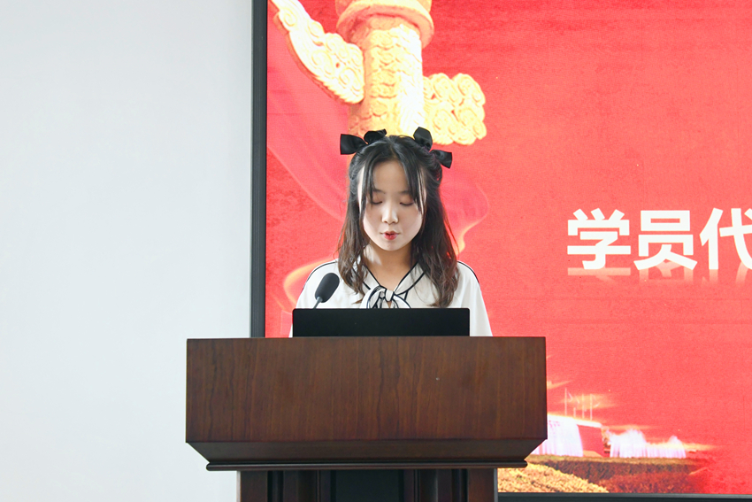 典礼伊始,全体肃立奏唱中华人民共和国国歌。培训班班主任刘莉莉宣读了《中共bevitor伟德委员会党校学员守则》。随后,学员代表曹瑞芸同学发言。她代表培训班学员郑重承诺:认真学习,尊师重道,完善自身,认真严肃对待每一次党课。