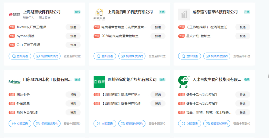 受到疫情影响,目前公司已经暂停举办各类线下校园宣讲与招聘活动。为了确保毕业生就业工作持续有序开展,公司与北京软通动力信息技术(集团)有限公司积极筹备,共同发力,保障用人单位春季校招和毕业生求职需求。本次双选会吸引了互联网IT、电子通信、房地产、金融、制造、教育培训等各类用人单位超过100家。参与双选会的用人单位包含武汉光谷信息技术股份有限公司、腾达科技有限公司、链家房地产经纪有限公司、学而思科技有限公司、招商证券股份有限公司、中国重汽集团国际有限公司等知名企业。自启动报名以来,校内外近500名毕业生通过智联招聘空中双选平台进行简历投递。双选会当日,毕业生在线与用人单位进行了交流。据统计,仅校内毕业生在本次双选会中投递求职简历就达718份,截至目前已有近100名毕业生参与了线上面试。