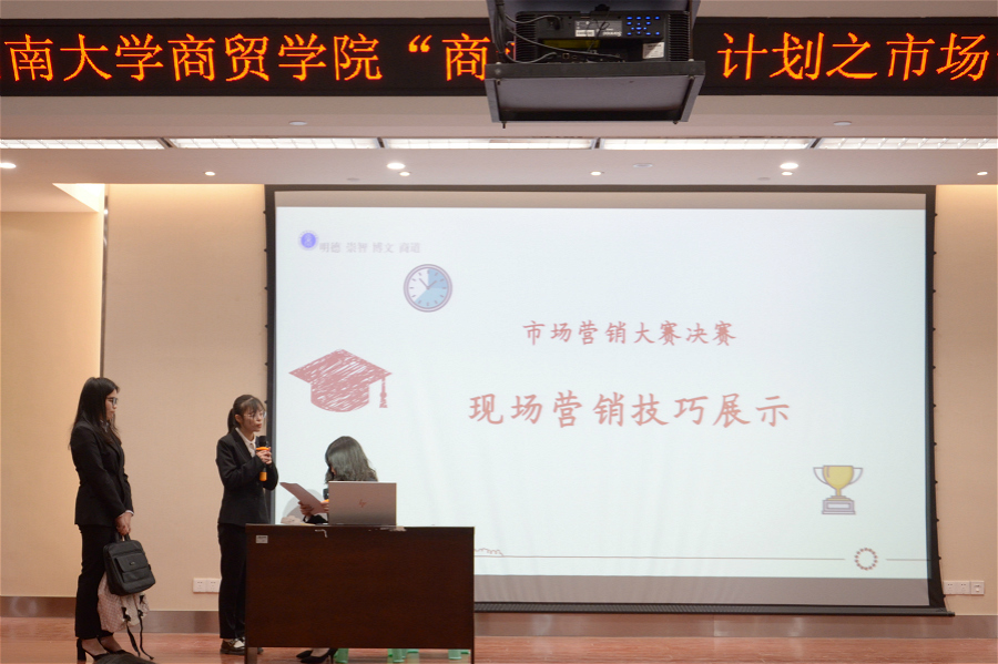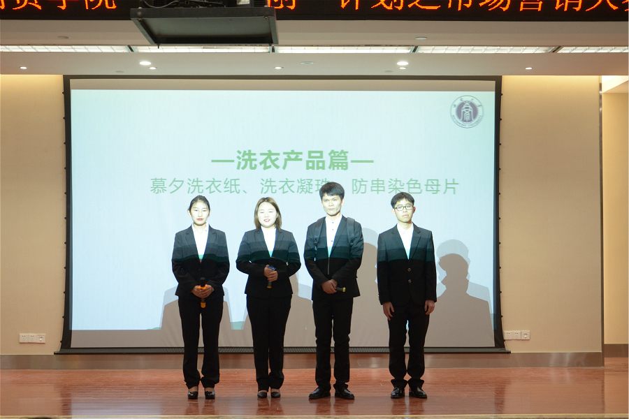 本次竞赛共有十支优秀队伍进入决赛,各队伍依次上台展示关于慕夕洗衣纸的营销策划。“好好读术”队在现场展示环节采用了新颖的直播带货模式,调动了全场观众的积极性;“没有队名”队采用SWOT分析和STP战略来展示项目背景和实现营销策划。在问答环节,评委组对各小组讲解技巧、市场定位等问题进行了点评指导。