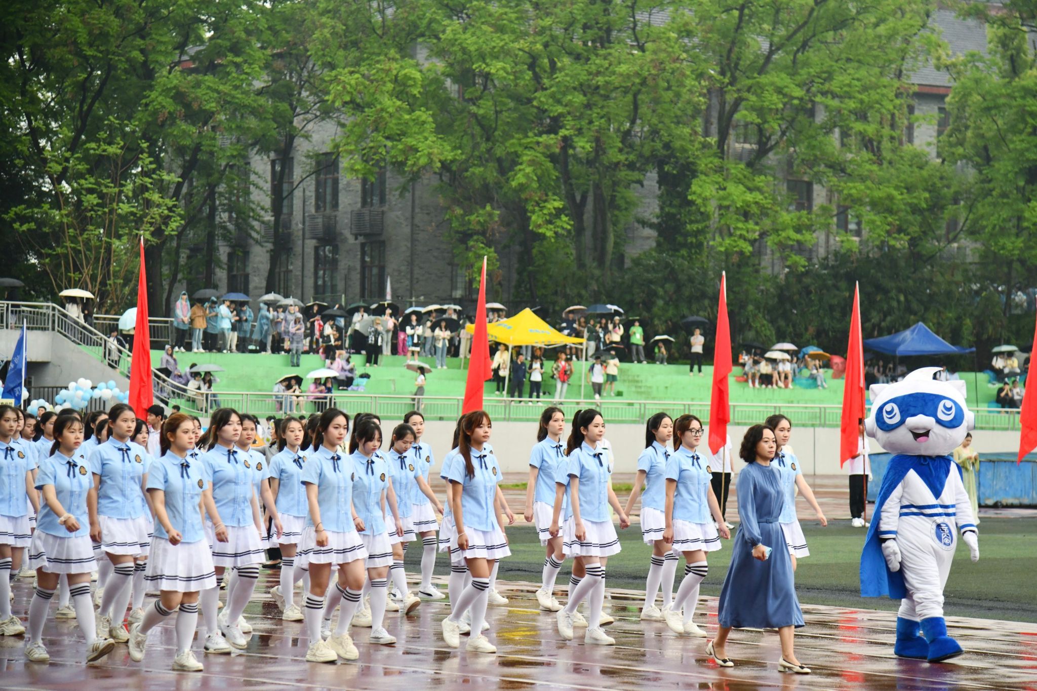 在19日举行的开幕式中,院旗飘扬,风击鼓动,滴滴雨点,浇不灭心中热情。公司方队服装统一,队伍整齐,步伐坚定有力,开场舞热情洋溢,展现出公司学子青春的活力和昂扬饱满的精神。