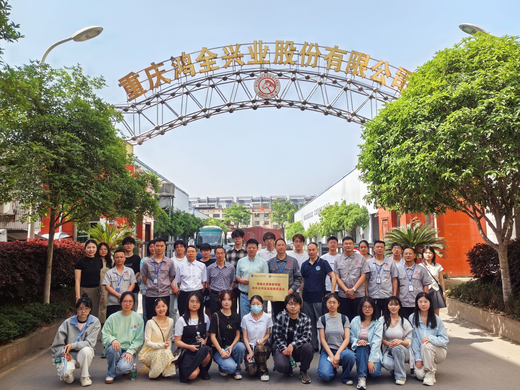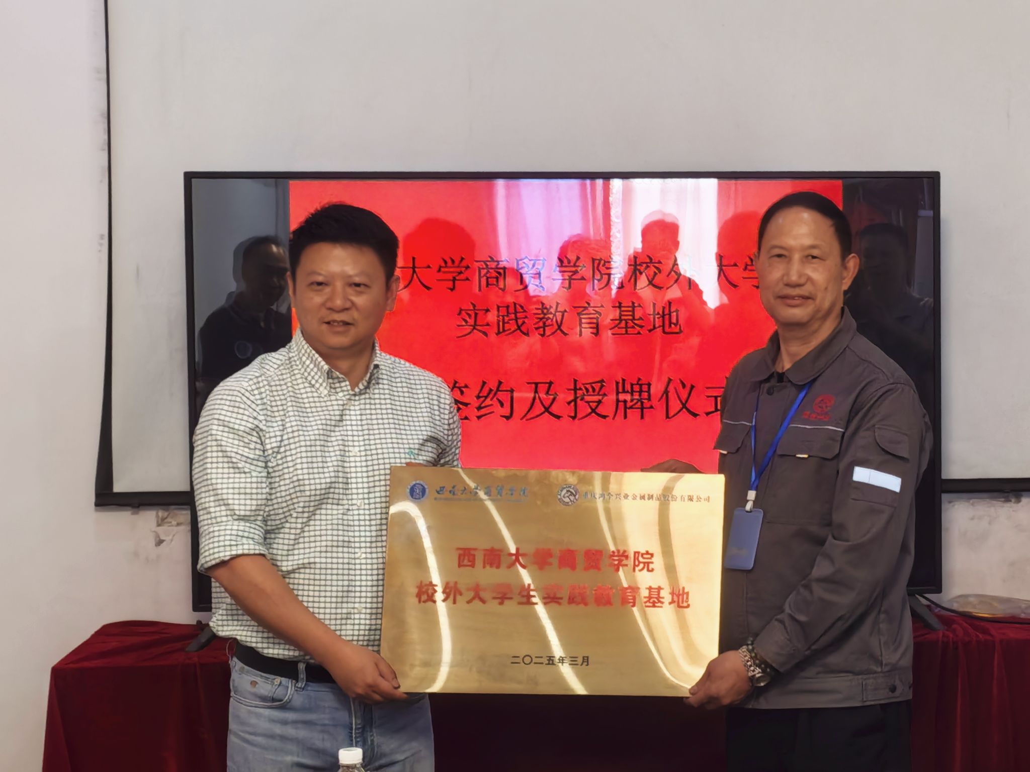 为推动产学研深度融合、强化就业服务体系建设,4月17日上午,公司赴重庆鸿全兴业金属制品股份有限公司举行实践教育基地签约暨授牌仪式。公司党委书记王熹,党委副书记、纪委书记文武,副经理胡继宽,市场营销系主任沈忠明,辅导员李雅丽,公司董事长周其建及高管团队出席活动。