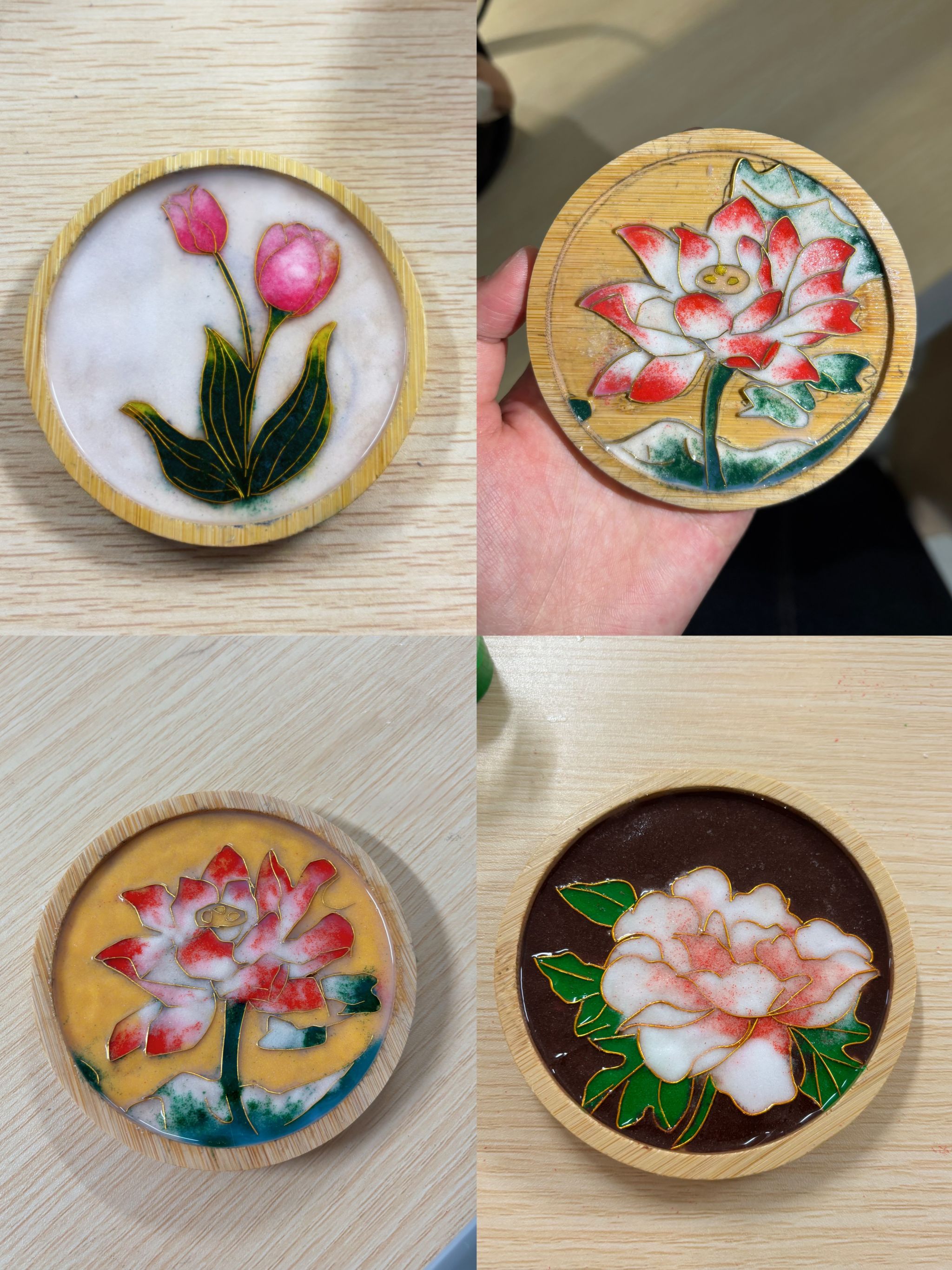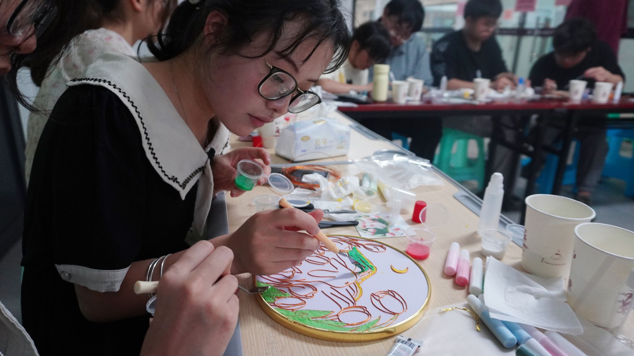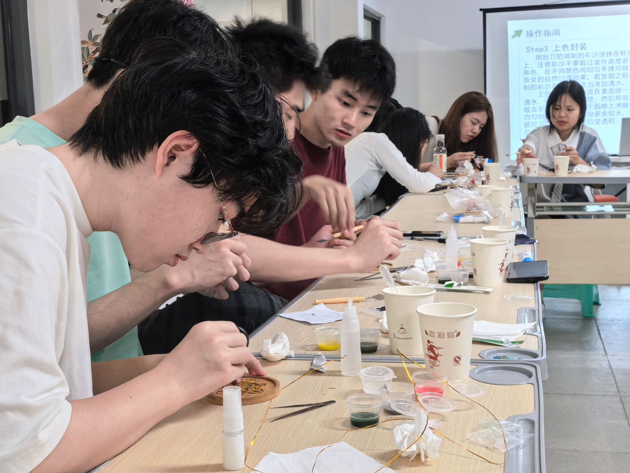 活动途中,同学们仔细调整铜丝弧度,反复斟酌色彩搭配,共同探讨谷雨意象背后的文化寓意,古老的工艺在青春的碰撞中焕发新生。经过三个多小时的精心制作,一幅幅精美的掐丝珐琅作品陆续完成,金丝勾勒的各色花朵在彩沙的晕染下栩栩如生。