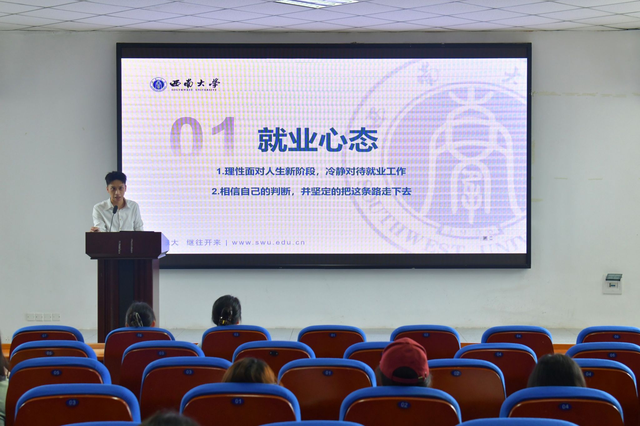 就业分享环节,黄义斐从宏观出发,提出“精准定位、务实择业”理念,强调理性评估自身与市场需求,制定规划,重视实习实践。周嘉荣结合求职经历,解析实习应突出专业优势,并分享简历制作、面试等实用技巧。