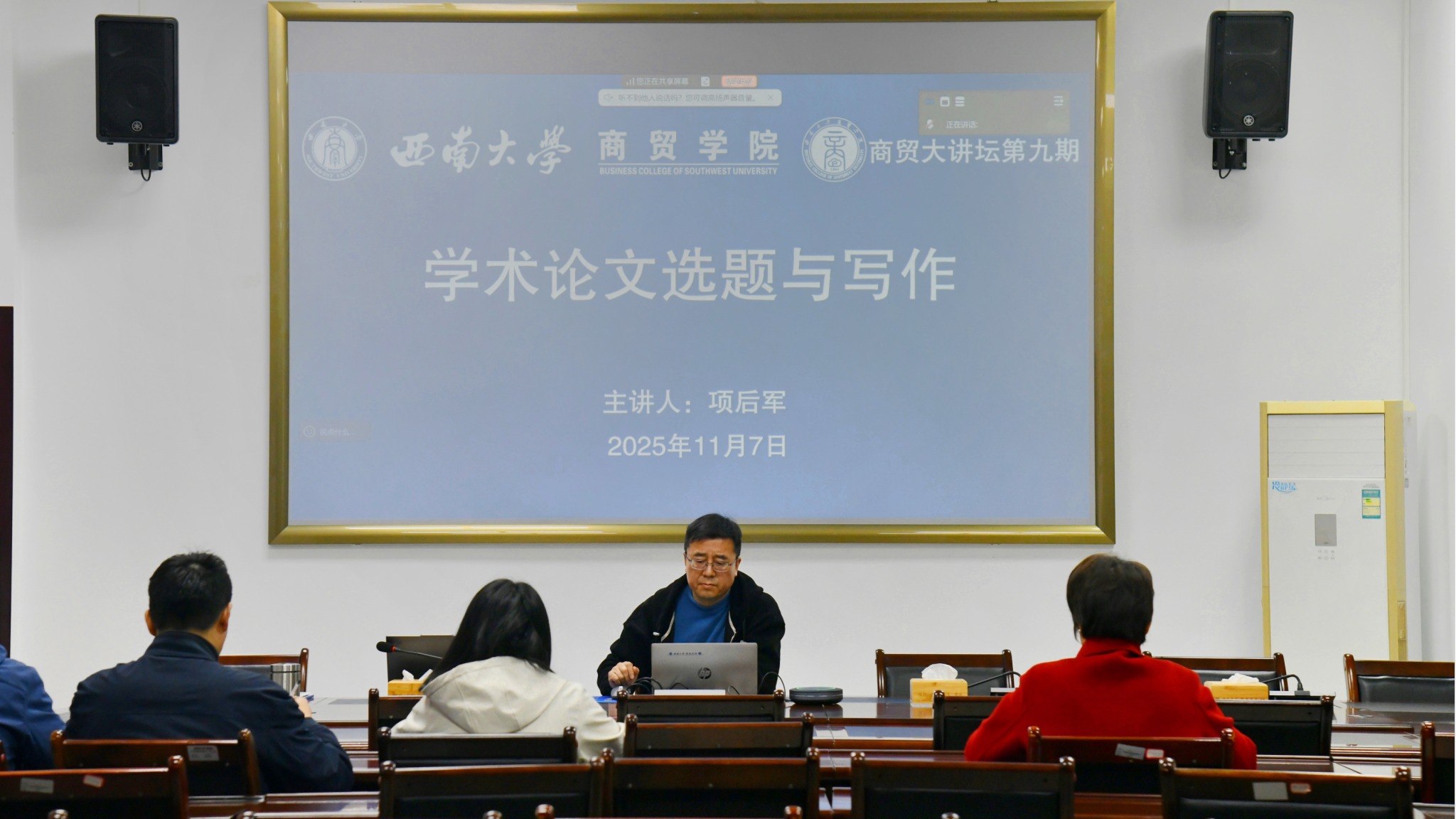 11月7日下午,bevitor伟德在荣昌校区8401报告厅顺利举办第九期“商贸大讲坛”——“学术论文选题与写作”专题讲座。本次讲座特邀南开大学经济学博士、广东金融公司金融与投资公司经理项后军教授线上主讲,活动现场由公司副经理高远东教授主持,公司师生共约60人参加。