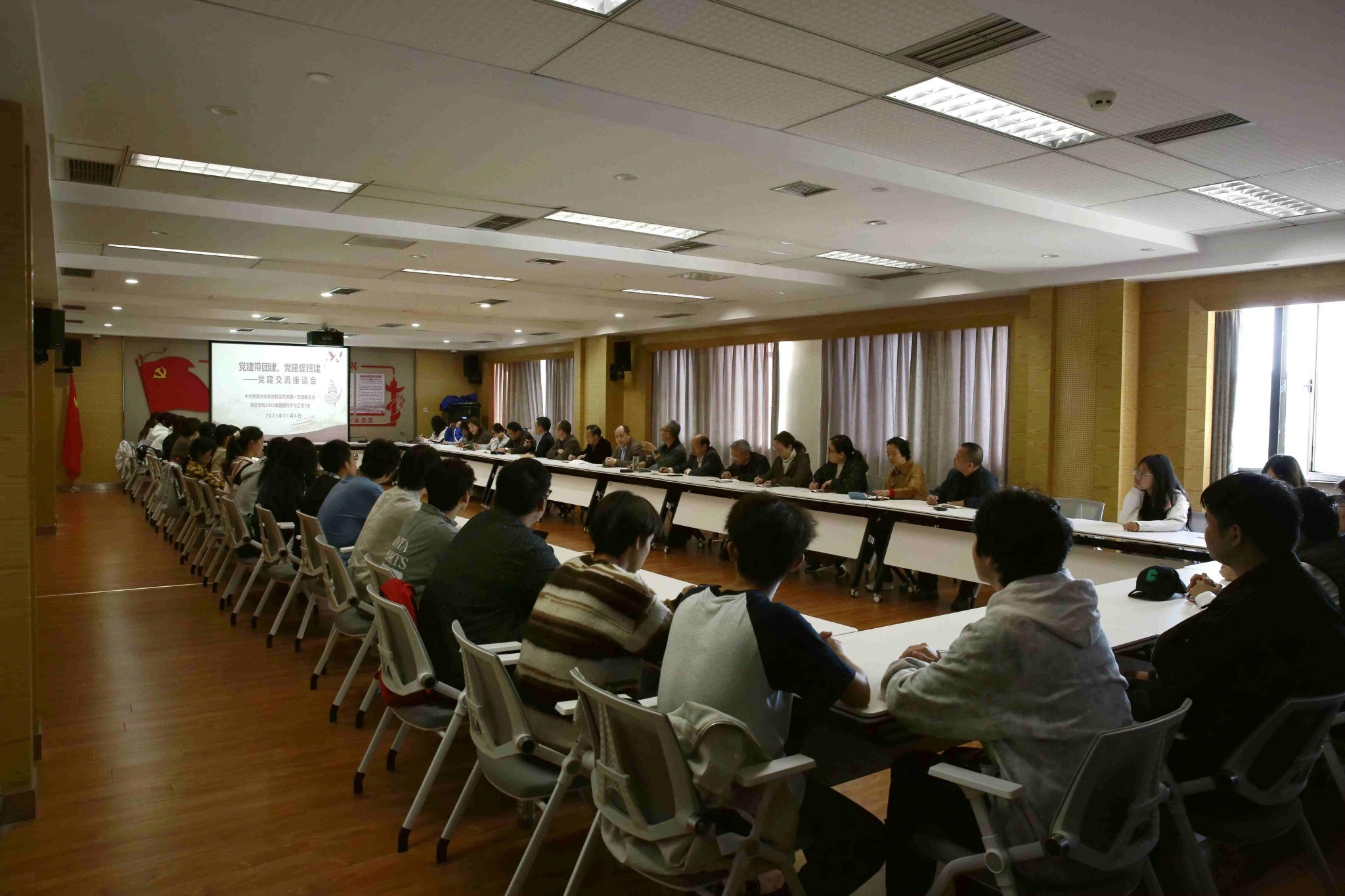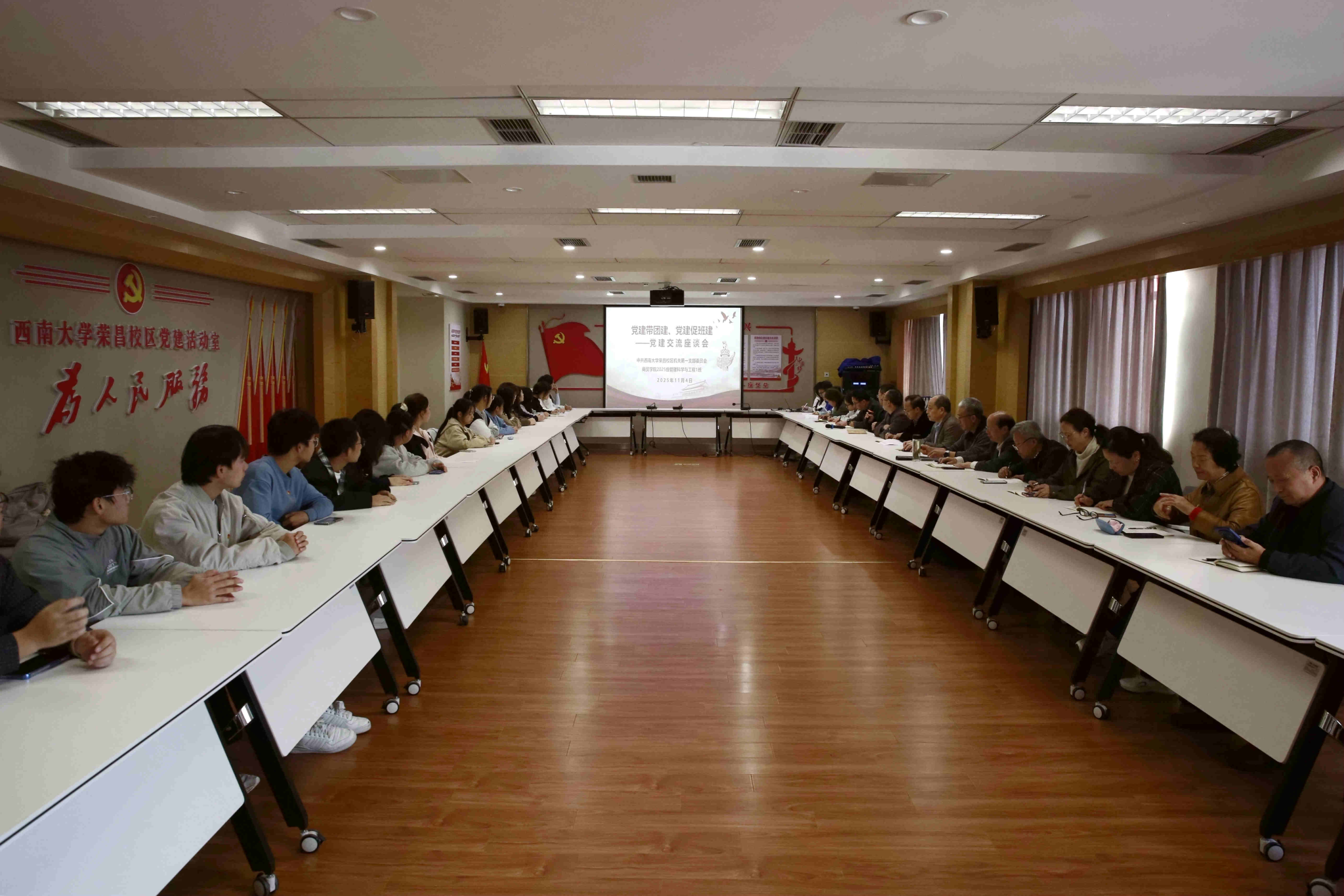 11月4日,荣昌校区机关第一党支部联系2025级管理科学与工程1班召开“党建带团建、党建促班建”交流座谈会,以党的建设带动基层班团建设。荣昌校区党工委书记、管委会主任周国安、副处级组织员包尔泉、机关党总支书记周克勇,公司党委副书记、纪委书记文武,荣昌校区管委会副主任兼 2025级管理科学与工程1班班主任曹烈斌,荣昌校区机关第一党支部全体党员、2025级管理科学与工程1班全体员工、2022级信管3班团支部书记与班长共同参会。座谈会由校区机关第一党支部书记蒋兴主持。