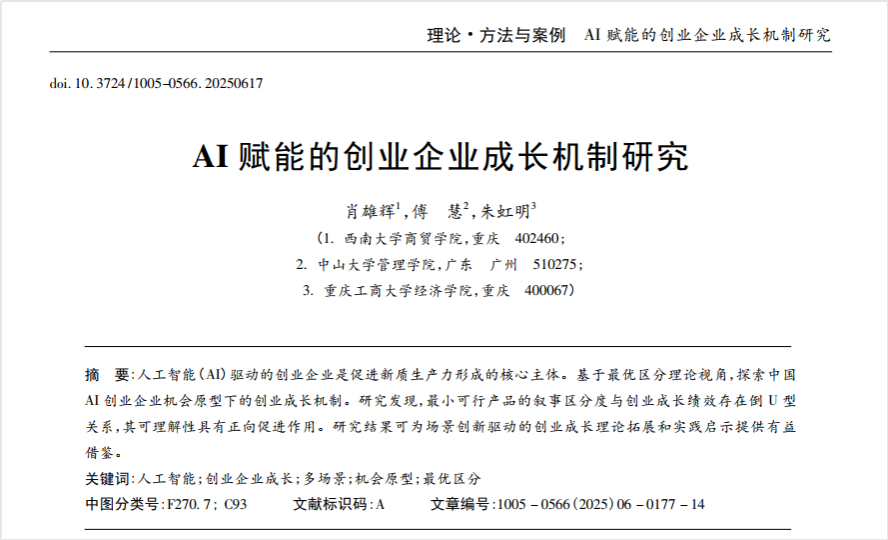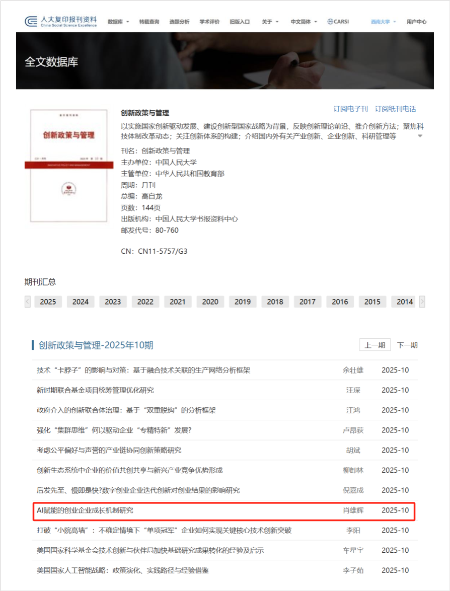 近期,公司教师肖雄辉及团队在《中国软科学》2025年第6期发表了题为“AI赋能的创业企业成长机制研究”的研究论文,同时该文被《人大复印资料》第10期“创新政策与管理”栏目全文转载。