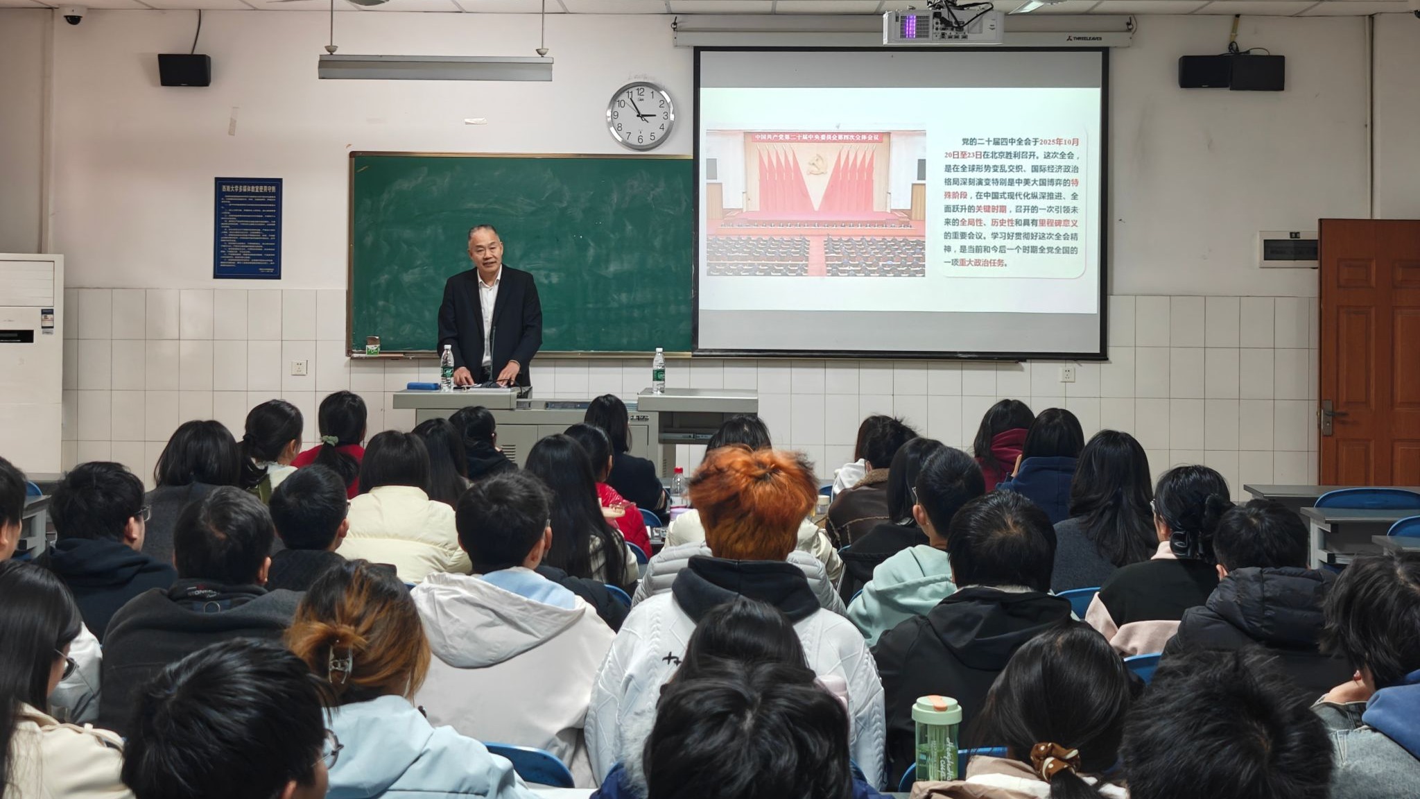11月20日下午,公司党委常委、副董事长葛信勇在荣昌校区第五教学楼502教室,以《深入学习贯彻党的二十届四中全会精神》为题,为2023级市场营销专业员工讲授专题《形势与政策》课程。校区党工委相关负责人、公司辅导员旁听,现场学习氛围浓厚。