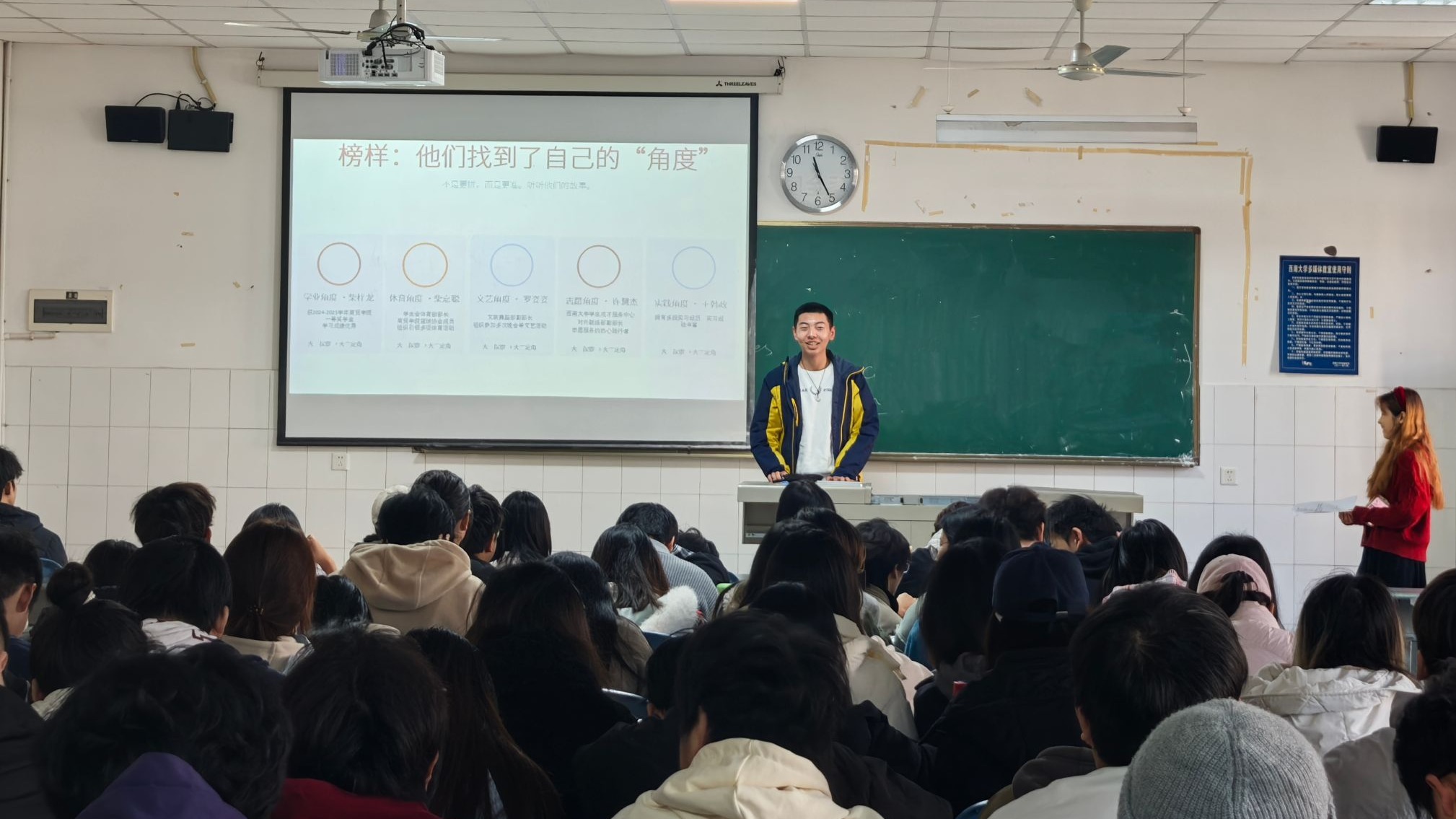 班会中,各专业积极搭建同辈交流平台,邀请崔小粟、张家赫、王诗妍、刘蕾、张浩玟、王玉霄、宋星茜,罗姿姿、王韩政、许慧杰、柴梓龙、柴嘉聪、龚锦悦、甯华、彭好、赵莲等16名同学,围绕专业学习技巧、学科竞赛备战、社会实践拓展、志愿服务体验、文体活动实践、职业规划探索多个维度,聚焦“如何平衡时间”“遇到瓶颈如何突破”“如何找准自身优势”等同学们普遍关心的问题,以亲身经历讲述成长故事,用真实案例介绍实用方法。这种“身边人讲身边事”的同辈引领模式,让同学们深刻体悟到“优秀并非遥不可及,而是始于明确目标、成于踏实行动”的成长真谛,进一步坚定了向榜样看齐、主动探索成长路径的信念。